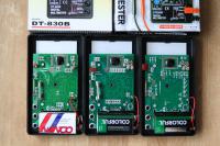 メインのICは基板に直付けされた「COB」タイプのようです。 よーく見ると、3台とも基板のパターンや搭載部品の配置が違います。 しかも2台目には他の2台に入っているヒューズが付いて無い・・・ (やはり中華クオリティ、それとも最も新しいようなので、ヒューズが不要になった!?) 基板にはバージョンとおぼしき型番と日付が入ってます。 (一応内蔵された電池の保証期間も・・・) 1台目(写真左):K1381,TY-M830B,20070927,電池02.2010 2台目(写真右):K1780,DT830B-081115,電池03-2011(部品ごとのシルク有) 3台目(写真中):K1539,DT-830B,Lihao,20061010,電池2010-08 |