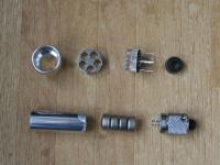 http://samidare.jp/jr7cwk/lavo?p=log&lid=281537 にあたり、「ビッグ5」のLEDの極性がいやらしい(ケース側がアノード(プラス側))になっている事から、極性を逆にする改造が簡単に出来ないものかと思い、「ビッグ5」を何処まで分解できるかチャレンジしてみた。 「ビッグ5」をLED側から見るとLED部分をケースに押し込んだように見える事から、「ランチャーライト」同様、電池側から押せば抜けそうに思えたので、細いドライバーを使用して押してみた。 LEDの足にダメージ与えそうだったが、ケース側をうまく固定(外形に近いサイズの丸い穴のあいた板を使用)し強く押した所抜け始めた。 なんとか抜けた結果がこの写真。 LEDの間隔を保持するパーツ(写真左上)、もっと薄いものかと思ったが、結構厚みがある。 この写真を見て分解される方は、そのつもりで。 結果的には極性の反転は、ここまで分解してしまえば容易な話。 |