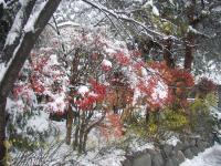 種子原人さんは、すぐに写真が入れられていいですね。凄いですね。・・・私の心の、秋の終わりは、この写真と同じです。讃岐は12月中旬まで秋の続きです。それからですね小春日和かなって思う日は、我が家の庭の私の小さな桜(庭に桜は植えるもんでないと言われているので鉢植えです)の葉は、すばらしい色(赤とオレンジと黄色を合わせた色)に紅葉しています。雪と紅葉なんて、私の心の中には無かったです。雪と一緒に想像できるのは、さざんかの赤い花と緑の松or咲き始めた白梅ですね。なので、冬支度が解かりません。兼六園の松等は、人が大勢観に来る公園だから、大切な松の枝だから、あんなに手間掛けて、きれいにしているのかと思っていました。