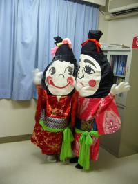 ほんまに、ありがとうございました。 さっそく取り掛かります。 昨日の私が楽しかった写真です。(腹踊り) 昨日、老人ホームの敬老会に玉すだれをしに行きました。 行く前に、「山さくらさんと○○さんと◇◇さんの3人は、玉すだれの後で、腹踊りをお願いします」って言われました。 私・・・「ちょっと待ってよ、私のお腹の肉は腹踊りに向いているかも知れんけど、腹踊りは男の人がするもんやろ! なんぼなんでも私はできないですよ!」 リーダー・・・「自分の顔は出さないから、大丈夫ですよ」 「お年寄りが喜ぶよ!」 私・・・{なんぼ、お年寄りが喜ぶって言ってもね〜、嫌じゃわな〜}って思っていましたが、 リーダーさんの思いに逆らわなくてよかったです。 メッチャクチャ楽しかったのは、中に入っている私自身でした。 私・・・「また、腹踊りをする時は誘ってくださいね。滅茶苦茶楽しかったで〜す」 ※ 後で聞いた話では、 人選は、お腹の肉ではなくって、この衣装の中に入れる小柄な人だったんですって・・・。 太っている人も、背の高い人もダメやったんですって! 良かったよ〜。 (小太りはOKやったです) ニッコリ! ※ この写真は、控室に帰ってきて○○さんと◇◇さんが衣装を脱ぐ前に 私が写しました。 私が入っていたのは、もっと可愛かったんですよ。 司会者に名前を聞かれて「さくらちゃんで〜す」って言いました。 ※ 一番凄いのは、この衣装を作った人やなって思いました。 手作りです。 中に入るのは、入れる人なら誰でもいいんですよね。 立っているだけでも可愛いんだから・・・・。 写真の写りは悪いですが、大きくしてようく見てくださいね。 |
