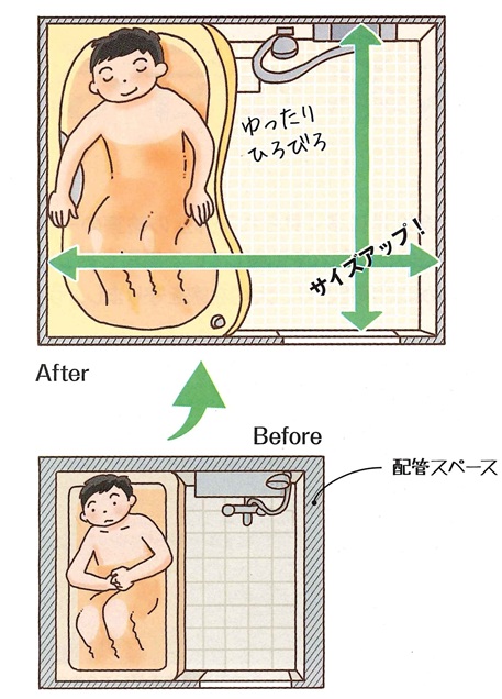 たった5~10㎝広くなっただけでも、浴室はかなり広く感じられます。
