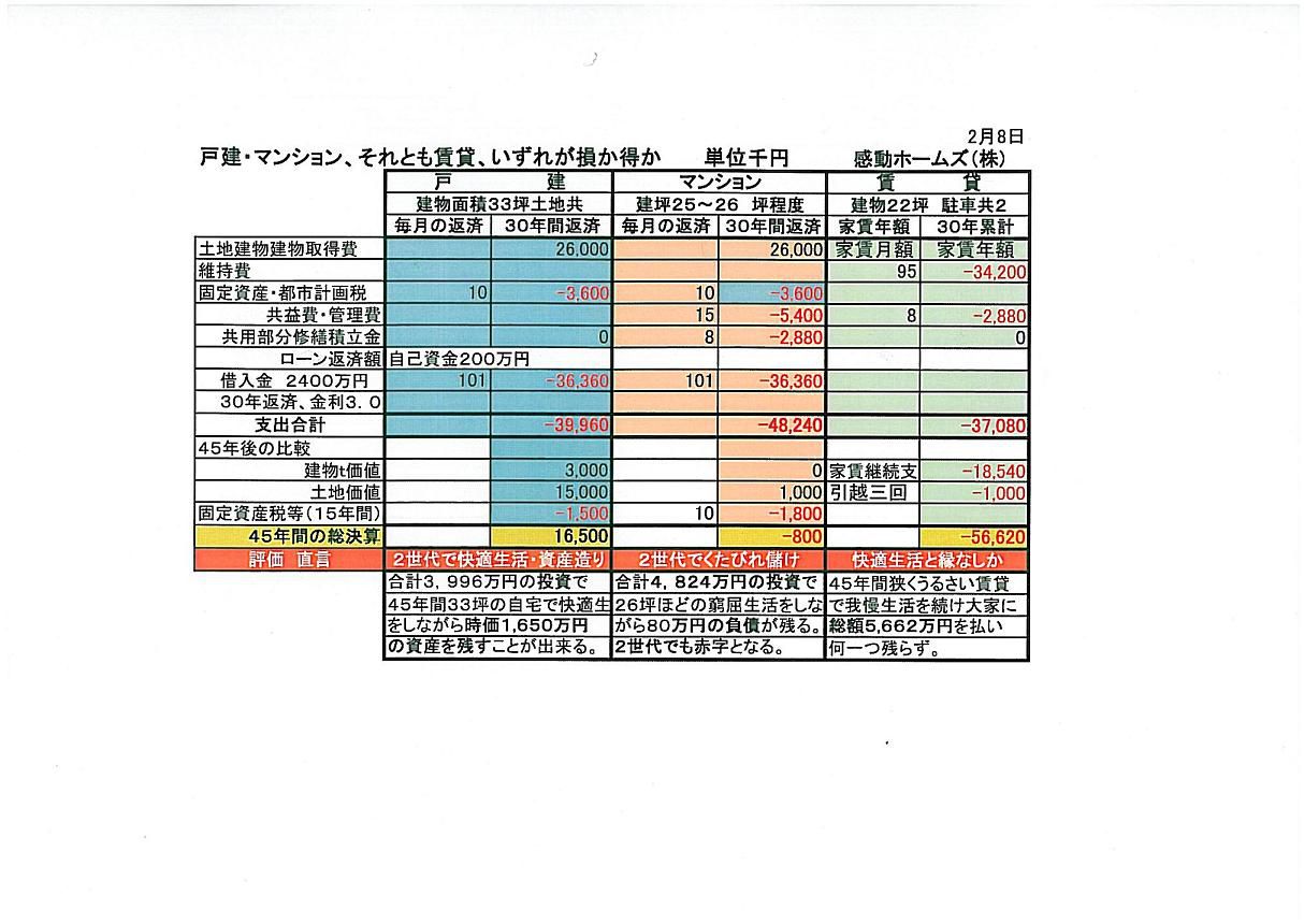 マンション = 2,600万円で4人家族では窮屈な25~26坪のマンションを購入する。(外断熱建物以外、決して高断熱ではなく決して快適生活とは不可)30年間でローン総額4,824万円を払う。(利率は少し多めに設定)その後15年間固定資産税と共益費と管理費の支払のみで住み続ける。但しリフォーム費用は省略する。45年後に土地建物を評価して