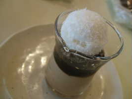 こちらはコーヒーゼリーで、ココナッツをまぶした球体のクリームが乗っています。持ち上げるとボールのクリームがコロンコロンと揺れてかわいい♪創作好きなシェ・ミオのご主人が楽しそうにつくっている顔が浮かびました(^^)。