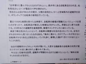 宮城県の新聞社から息子が取材を受けました。(電話にて)東日本大震災の復興支援ということで被災地での自転車修理ついて聞かれました。