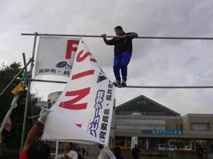 長井マラソン大会のゴールの撤収。あんなに腹が出ているのによくあんな高いところにのぼれるなぁ。