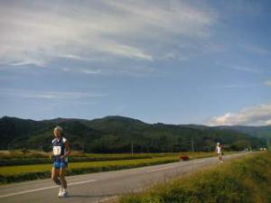 長井マラソン大会が行われた今日みたいに、寒くて小雨の天気じゃなくてよかった。写真は秋晴れのした、山のふもとを走るランナー