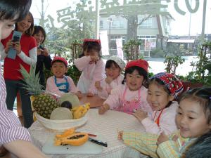 パーティボックスの中のフルーツを探して、仕入れる担当の