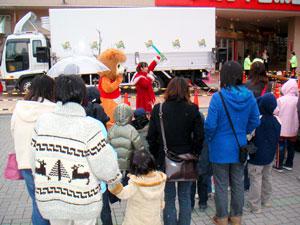 山形から応援にかけつけたぬいぐるみのシシマル君とサンタ風ピエロの司会のおねえちゃんもリハーサルをかねてマイクのテスト中、、