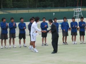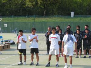 どんよりと曇った肌寒い朝です。 予報では、午後から雨なのですが、何とかこのままで・・・・ 9:30 スタートです。 お知らせです。 その1 お弁当箱の落し物が総合受付に届いております。 お心当たりのある方は、ご連絡ください。 大会本部臨時電話 tel 055-243-6414 その2 日本テニス協会公式ブログに昨日の 選手会クリニックのニュースが掲載されています。 ごらん下さい。 日本テニス協会公式ブログ |