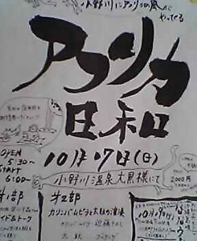 10/17(日)17:30より小野川・大黒様にて「アフリカ日和」と題して 第一部、ケニア在住早川千晶さんのスライド&トーク 第二部、カリンバ・ムビラと太鼓の演奏 を催します チケット¥2000 問合せししど
