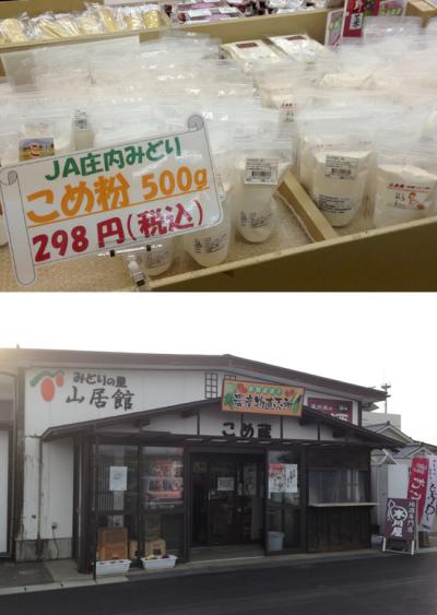 ▶扱っている商品名 JA庄内みどり こめ粉(庄内産はえぬき・200メッシュ) 500g/298円 米の粉(庄内産はえぬき・200メッシュ)300g/180円・500g/300円 ▶店舗情報 住所/酒田市山居町1-3-1(地図はコチラ) 営業時間/9:00〜18:00、9:00〜17:30(11〜2月) 定休日/1/1〜1/3 電話番号/0234-26-6222 ホームページ/http://www.sankyokan.jp/ ▶持ち込みの米を米粉に製粉できます。 100・200メッシュ/1kg 200円、300・400メッシュ/1kg 300円 月〜水曜日は一般の持ち込み可能。込み合っている場合や、 それ以外の曜日は受付可能ですが、一時預かりし後日製粉に なる場合もあります。 |