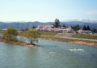 ふと足を止めてまわりの景色をみたくなる、そんな気持ちにさせられる高瀬大橋からの眺め。晴れた日には川の上流に月山が見える。眼下には生前とした田んぼが広がる。心を落ち着かせてくれるそんな風景がここにある。