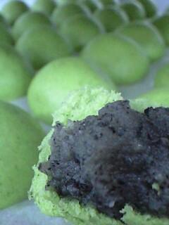 皮に よもぎを練り込み、餡は 白ささぎのベースに ごまが たっぷり練り込んでいる ごま餡です。