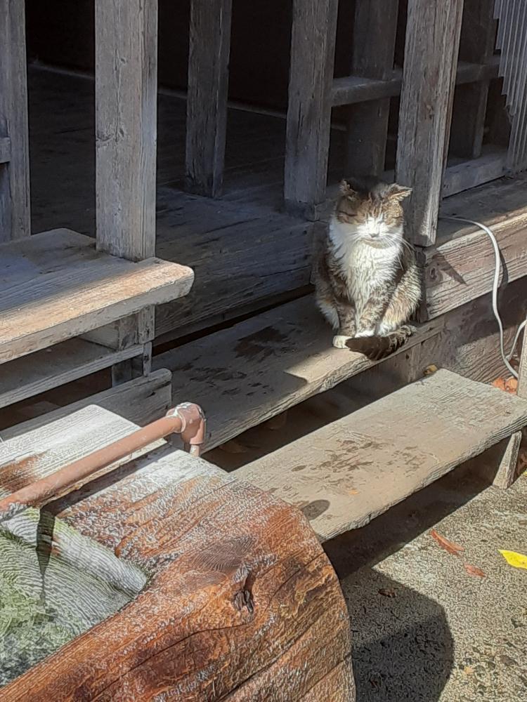 ちいきねこの タンタンは 定位置の足湯わきにて ひなたぼっこです。
