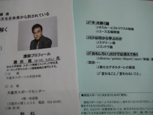 3月5日天童市スポーツセンターで、天童市スポーツ少年団本部の指導者研修会に 参加しました。我が恩師 勝田先生からラグビーに限らず、「スポーツとは?」 「なぜ?今、子どもたちにスポーツが必要か」を学べたと思います。締めくくりの映像が、スポーツの中にあるたくさんの笑顔を老若男女取り混ぜて見せていただきました。この喜びに出会うために、スポーツの楽しさを伝え、共にenjoyしていきたいと改めて感じました。僕のテーマでもある、スポーツとフルーツを繋ぐものは やはり「にこにこの笑顔」だと確信しました。 |