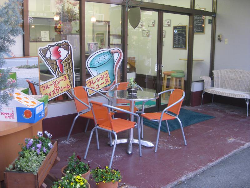 狭い店内よりも、清々しい春風の中でフルーツポンチッチ、フレッシュジュース、パフェをどうぞ。