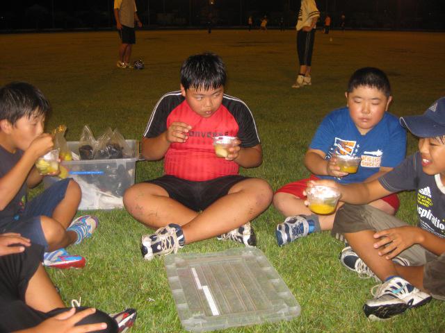 タグラグビー教室恒例?のお楽しみ、グラウンドで車座になって、ビタミン補給です。ルールはスプーン一杯食べたら、隣にパスです。最後のシロップを飲み干すまで、「回せ、回せ!」のチームワーク抜群。仲間の輪がより強くなり、たまらない笑顔が溢れました。スポーツの秋に、フルーツポンチッチ♪