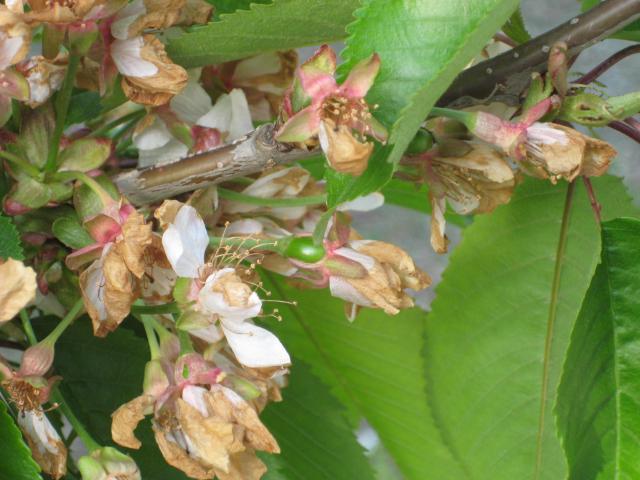 白いさくらんぼの花が散り、緑色の実が顔を出し始めました。