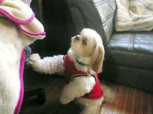 と〜ってもおりこうさんで、かわいい「ななちゃん」でした。 当館の「スピア」もかなり、気になっていたようですが・・・ 「恋の病」に陥ってしまった「スピア」です。 「ななちゃん」また、おいで下さいね。お待ち申し上げます。 |