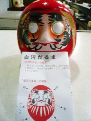 「女将にお土産」と、白河だるまをいただきました。 後ろにお菓子が入っていて(栗饅頭)お菓子もおいしかったぁ(^.^) 白河だるまは縁起物だそうで、だるまの左目に目玉を書き入れ、 希望を願えば必ず成就するのだそうです。 願望成就した時は、もう片方の目を入れる といわれているそうです。早速私も・・・・ H様本当にありがとうございました。 |