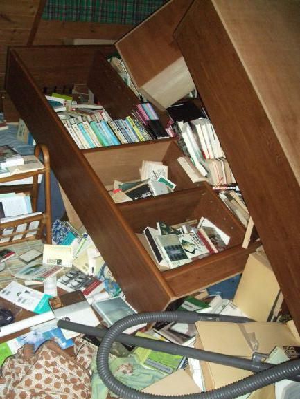 (写真は本棚が倒れ、周囲には本が散乱した=2011年3月11日、花巻市桜町の自宅で)