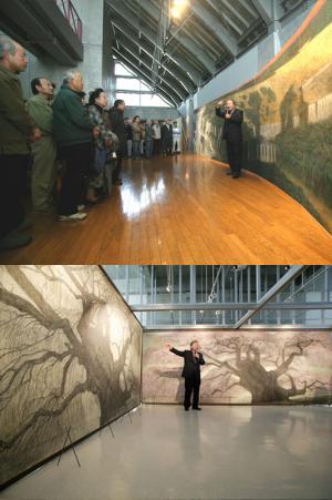 ■写真上:ギャラリートーク風景/12メートルをこえる大作『イグアス(ブラジル)』の前で