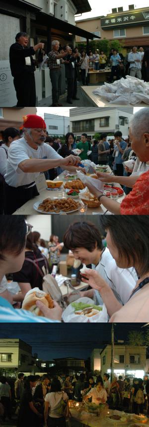 ■写真上:7月7日に、『ギャラリー絵遊』+『蔵大マス』の庭で開催された、『I'm here. 2006』のレセプションパーティーの幕開けです。写真は乾杯の様子。左から松本哲男学長、ギャラリー絵遊オーナーの駒谷氏、そして、フライヤー17,000枚分の印刷用紙を無償提供していただいた田宮印刷株式会社の工藤社長。祝杯は工藤社長から差し入れていただいた高級ジャンパンで景気良く。 ■写真中上:『Link』プロデュースのベーグルパーティーに、強力助っ人として参加していただいたCafe Espressoの高橋昌平マスター(左)。高橋さんからベーグルにチーズを挟んでもらっているのは、『ぎゃるり葦』オーナーの土井忠夫さん。今回は後藤+池谷+阿部の洋画出身のペインター3人組がお世話になりました。『I'm here.2007』で、もっともパワフルだったのは、間違いなくこのお2人でした。 ■写真中下:芸工大の在学生・卒業生にとって何でも相談できる「お母さん」的存在の大学職員の方々。手前左から学生課の小林さん、原田さん。中央奥は図書館の谷川さん。この日はパーティーの仕込みに主婦パワーを発揮しつつ、大勢集まった卒業生たちと久しぶりの再会を喜び、そして『Link』プロデュースのオリジナルベーグルサンドを頬張る。息子の手料理を味わう気分? ■写真下:梅雨の奇跡的な晴れ間。夕方からスタートしたパーティーは、真っ暗になっても立ち去り難く、結局夜の9時過ぎまで続きました。参加者は300名を超えました。 (撮影:加藤芳彦) ---------------------------------------------------------------------------------- 正直に告白すると、昨年の暮れに、今年の『I'm here.』の開催日時を決めた段階では、頭の中から「日本の梅雨」の存在がすっかり抜け落ちていたのです。 『ギャラリー絵遊』さんの手入れの行きとどいた庭を見た時、「これだ!」と直感的にひらめいたガーデンパーティーのアイデアでしたが、日時をフライヤーに刷り込み、卒業生約4,000人に送付し、いよいよその詳細を詰めていこうとしたところで、山形市内の雲行きが連日おかしくなり、地元出身の職員から「山形の七夕は晴れたことがない」と困惑げに聞かされ…た時すでに遅し。 パーティーのプロデュースをお願いした『Link』のメンバーと、ハラハラしながらyahoo!の天気欄をチェックする日が続いたのですが、あえて雨天の代替え案はなし! と背水の陣で準備を進めたところ、関係者の日頃のおこないが宜しいのか(?)ずっと雨続きの『I'm here.』展の会期中、不思議とパーティーと翌日のトークイベントは天気に恵まれました。 18:30パーティー開始の30分前から、続々と卒業生+在校生が集まり、松本学長の豪快なシャンパンオープンが、夕方の空にコルクの弧を描き、パーティーの幕開けを告げると、『Link』が用意した250食分のベーグルは次々と無くなっていきました。(なかには4つ食べた学生も!) この日のために、『Link』メンバーが考案したオリジナルベーグルは、地元で人気のベーカリー『シャルマン』に焼いてもらった品で、生地に山形の「だだちゃ豆」「山ぶどう原液」「県産トマト」を練り込んだ特別なもの。 ボランティアスタッフの女子学生が、包丁とまな板持参で集まり、お昼過ぎから2/1スライスし続けたベーグルに、参加者がおのおのテーブルに並べられた食材をサンドして食べるという趣向。パーティーのコンセプトをオリジナルスタンプに仕立てて捺した紙に、色とりどりのベーグルに挟んで食材を乗せれば、無駄な食器やカトラリーは使わなくていいというエコなパーティーなのでした。 大きなテーブルに所狭しと並べられた各種の具材は、これまた山形産にこだわり、ギャラリーのすぐ隣にある『佐藤牛肉店』からは「米沢牛コロッケ」(※写真上の看板に注目)や特選サラミをフューチャーし、通り沿いにある豆腐店からは「豆腐ハンバーグ」をセレクト(「塩気と効かせて」と特別オーダー)。これらは余計な包装をせず、お店からトレイごとドサッと届きました。 この他、『Cafe Espresso』高橋マスター手づくりのサクランボのジャムや、本格チーズ、県産の瑞々しい野菜たちが、『Link』メンバーデザインによる有田焼の皿にレイアウトされます。 ドリンクも、大学内ではないので堂々とお酒が並びます。高畠のスパークリングワインに出羽桜の吟醸酒。アルコールNGの未成年には、県産フルーツの濃厚なジュースが振舞われました。 様々な「味」を組み合せる楽しさ。パーティーを通して交流する在学生と卒業生。地元にある様々な美味しいものとの出会い。そして、「食」と「デザイン」の融合が演出するピースフルな空間と交流。『Link』のねらいは見事的中し、パーティーは大成功でした。 会の途中で『I'm here.2007』参加作家や各ギャラリーのオーナーさんたちによるマイクパフォーマンスも会場をおおいに盛り上げましたが、たくさんのお酒にも関わらず、だらしない酔っぱらいは一人も出ず、終始なごやかな会話がざわめく大人の雰囲気ただようパーティ