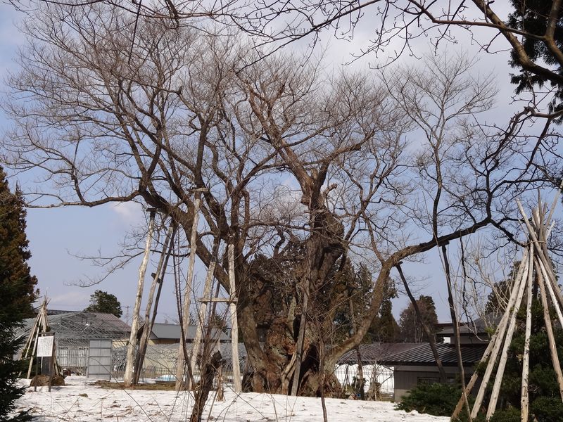4月4日(木)の草岡の大明神桜は「つぼみ」です。現在の大明神桜の予測は開花/23日 見頃/28日~となっております。あたりにはまだ雪が残っています。肌寒い日が続く中、桜の開花が待ち遠しいですね(*・v・*)
