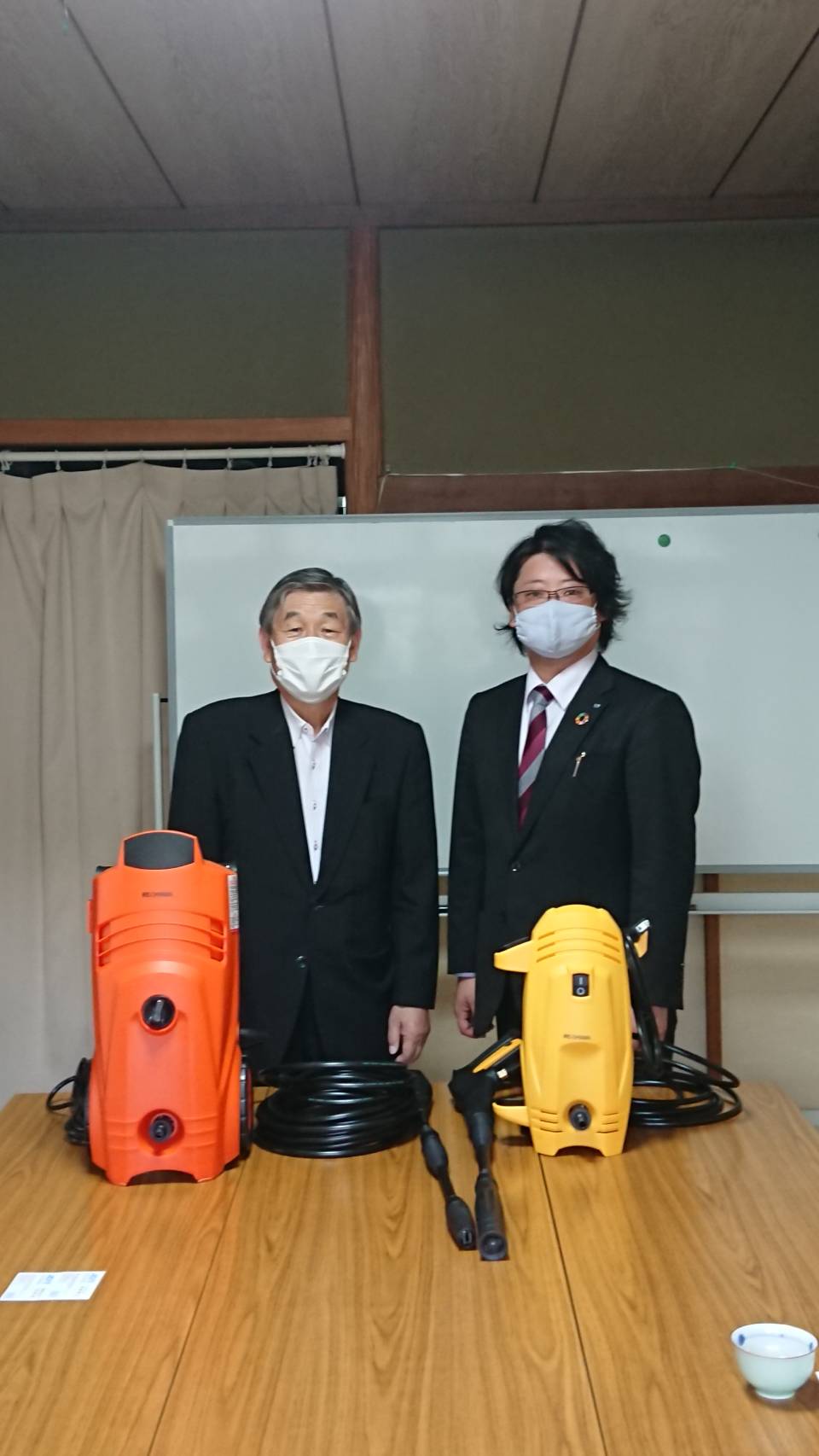 6月に社会福祉協議会荒井信毅様をお呼びし、災害ボランティアセンター及びマニュアルについて学ばせていただきました。その後の話し合いで、長井市で今後災害ボランティアセンターを設置した場合に必要と思われる資機材および不足している資機材を確認し、不足している中でも重要な高圧洗浄機2台を8月に寄付させていただきました。