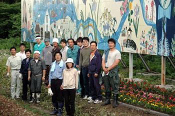 ▼長井駅大壁画前花植え作業