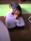 私のヨガマットの上に寝転び、カイロ入りぬいぐるみ枕にあごをのせて反省している模様です。こにくたらしいですが、自分のしつけの甘さに反省しつつ、夏までに「伏せ」を教えようと決心をしたのでした。(ミーナは伏せができない)