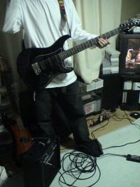 こ、これはライブハウスでしょうか?いやいやよく見ると着物が見えますな〜〜〜。ということはライブハウスではないようですな。これは正月家におけなくなった楽器(受験のため強制撤去)を別な場所に保管するためにもっていったのですが、どうせだったので一回全部セッティングしてみた時のひとコマです。実はここにたっつーさんのエレキも隠れています。ま〜よく集めたものだな〜と思いますわ。(すべて中古品)ということでした。