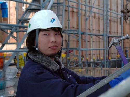 型枠工事を担当する、安部工業の酒井喜俊(さかいよしとし)さん27歳。