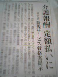 【介護報酬定額払いに/厚労省新規サービス骨格案提示】 ■厚生労働省は12日、来年4月から導入される介護予防などの新規サービスについて、 事業者に支払われる介護報酬の骨格案を、社会保障審議会介護給付費分科会に示した 。 ━━━━━━━━━━━━━━━━━━━━━ +++『社会保障ニュース』編集室+++本部 http://plaza.rakuten.co.jp/socialsecurity/ ※リンク生成されない場合はアドレスバーに コピペしてください。 ━━━━━━━━━━━━━━━━━━━━━  |