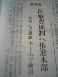 【厚労省 医療費抑制へ推進本部/「在宅」など課題 チームで検討】 ■厚生労働省は12日、来年度の医療制度改革に向けて、医療費の伸びを抑制するため 、省内に総合推進本部を設置する方針を決めた。来週にもメンバーを確定し、検討作 業に着手する。 ━━━━━━━━━━━━━━━━━━━━━ +++『社会保障ニュース』編集室+++本部 http://plaza.rakuten.co.jp/socialsecurity/ ※リンク生成されない場合はアドレスバーに コピペしてください。 ━━━━━━━━━━━━━━━━━━━━━  |