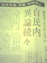 【議員年金与党「即時廃止」自民内異論続々】 ■特権的だとの批判がある国会議員互助年金(議員年金)の見直しで、与党が「即時廃 止」方針に転換したことについて、20日の自民党の幹部協議や各派閥の会合で異論が 相次いだ。民主党は同日、議員年金を来年4月に廃止する法案を国会に提出しており、 自民党執行部は独自案をまとめて合意を図る考えだが、即時廃止には党内の抵抗が強 いことが浮き彫りになった。 ▲まぁこれまで地方を含めた議員さんたちが、いかに議員年金の上にあぐらをかき、 本当の年金改革をすることに、どれだけ不真面目だったかがよく分かります。 ━━━━━━━━━━━━━━━━━━━━━ +++『社会保障ニュース』編集室+++本部 http://plaza.rakuten.co.jp/socialsecurity/ ※リンク生成されない場合はアドレスバーに コピペしてください。 ━━━━━━━━━━━━━━━━━━━━━  |