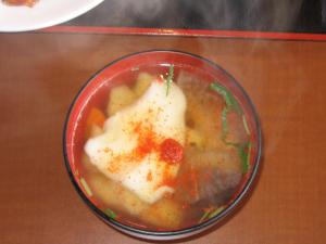 噂には聞いていた「ひっつみ汁」を思いがけず初体験しました。ホテルの朝のバイキングに別メニューで振舞われていたので、別腹でいただきました。