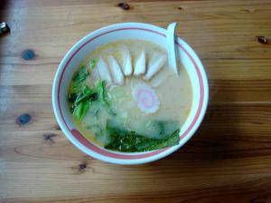 店のウリはスープ、取り方牛と豚ガラを16時間煮込んだというだけあって、熟成という表現がピッタンコ、実に奥が深いスープだ。渾然一体化していてコクがあり、スープとしての出来は県内でも屈指のスープだと思う(ネギ、白髪葱がスープに与えるウマミも見逃せない点である)。 具は、チャーシュー、ゆで卵、メンマ、ナルト、海苔、ネギ、白髪葱等、一見華やかなラーメンであるが、麺は、ちじれ麺で、スープがよくからみ口の中で踊る感触がいい。豚バラ肉のチャーシューがまた憎い逸品で、濃いめの味付けに頼ることなく、噛むとしみ出る豚肉のジューシーな肉汁がとても「まいうー」であった。 |