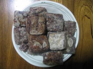 これ何だか分りますか、おはぎ?ブブッー、羊羹?ブブッーちゃいますがな、金妻ちゃうちゃう金つばですよ。不恰好ですけど、我が家自家製金つばで、初めて手作りにトライしたものです。ケーキはよく各家庭で作ると思いますが、和菓子を家庭で作るつうのも珍しいんじゃないかな。