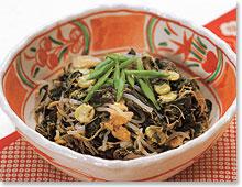 でもこの「ひょう」ですが、栄養価が高いようで茹でて天日干しにすることでビタミンDなどの栄養が蓄えられるそうです。夏にゆでて醤油&からしで食べる場合もありますが、たいていは 打ち豆、油揚げ、ちくわ、人参などと共に煮て、よく正月に食べます。今年もひょっとしてよいことがあるようにと、ひっかけて縁起のよい食べ物の一つとして伝えられたいます。 作り方は、ひょうは洗って水から火にかけ、煮立ったら火を止め、一晩そのままつけておきます。そして翌日、水を2〜3回取り替える。油揚げは油抜きをして短冊に切り、人参も同様に短冊に切る。 ちくわは半分に切ってから輪切りにする。油大さじ2で材料を全部さっと炒め、次にダシ汁と調味料を全部加えて、中火で汁がほとんどなくなるまで煮る。おつまみにもなる田舎料理の一品です。 |