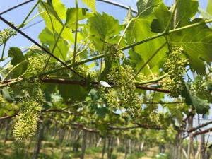 うちのぶどう畑のデラウェアが満開を迎えました。この5月随分暑い日が多く、開花も昨年より若干早いです。満開期は畑が甘い芳香に包まれます。