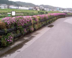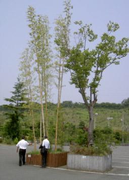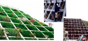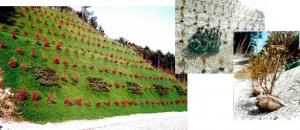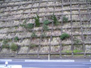 岩盤法面に特殊アンカーピンを用いて苗木を垂直に保持固定し、根鉢及び周囲に客土や厚層機材の吹付覆土をして植栽緑化を図る工法(D-1工法)。