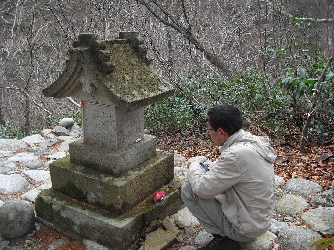 三渕の歴史と伝承調査研究のためどうしても見極めておきたい事があったので現地へ参拝してきました。例年に珍しく降雪も無く(三渕の明神様に護られてラストチャンスでした)絶好の気象条件に恵まれ大変良い成果が得られました。今回のコースは県道木地山線・掘割から三渕への峰づたいで歩きました。往路は1時間15分位でしたが、復路は1時間30分ぐらい要した(帰りは登り道がきつかったことと、膝小僧に笑われました・・今も痛いです。)但し、掃出峰からは新しい長井ダムの遠景、降り返れば木地山ダムと祝瓶山が初冬のたたずまいを静寂の中に魅せてくれました。