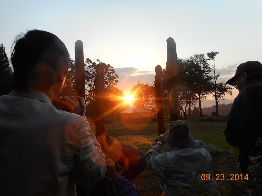 「秋分の日の今日は、4本柱のちょうど真ん中から日の出を見ることが出来る」ということで、観察会が今朝5時45分から長者屋敷遺跡で行われました。日の出の時は皆さんから感動の声が聞こえました。