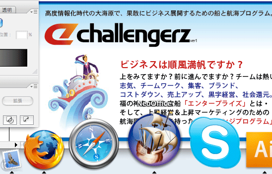 果敢にビジネス展開するための船と航海プログラム。 ビジネスは順風満帆ですか? 上をみてますか?前に進んでますか?チームは熱いですか? 志気、チームワーク、集客、ブランド、 コストダウン、売上アップ、黒字経営、社会還元。 福の神をのせた宝船「エンタープライズ」とは・・・? そして、上昇経営&上昇マーケティングのための 航海図と羅針盤を持った「チャレンジプログラム」とは・・・? 以上はStepupの主力サービスとなる チャレンジャーズ(challengerz)の紹介文です。 そしてドッグの「船アイコン」は MacOSXネイティブのオフィス・スイート[NeoOffice]です。 最近、MS-Officeから完全乗り換えしました。 ・・・・・・船つながり?! cosmosプロジェクトで年越しできるよう 日々ブラッシュアップ中・・・ 参照→ 次はcosmosの海へ 参照→ NeoOffice |