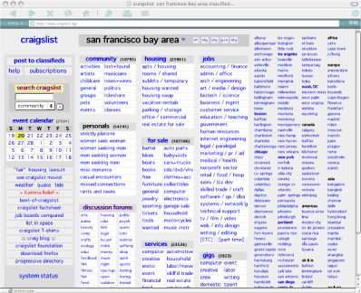 USAサンフランシスコを中心に、5カ国57都市、利用者580万人、10億6000万PVを超え広がるコミュニティーサイト。一部の求人広告以外すべて無料、TEXTだけの「世界一退屈なデザイン」は超クール。