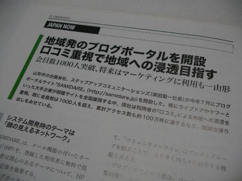 山形市の企画会社、ステップアップコミュニケーションズ(柴田聖一社長)が今年7月にブログポータルサイト「SAMIDARE」(http://samidare.jp)を開設した。既にライブドアやヤフーといった大手企業が同種サイトを全国展開する中、同社は利用者の「口コミ」による地域への浸透を重視。既に会員数は1000人を超え、累計アクセス数も約100万件に達するなど、順調な滑り出しをみせている。---略---