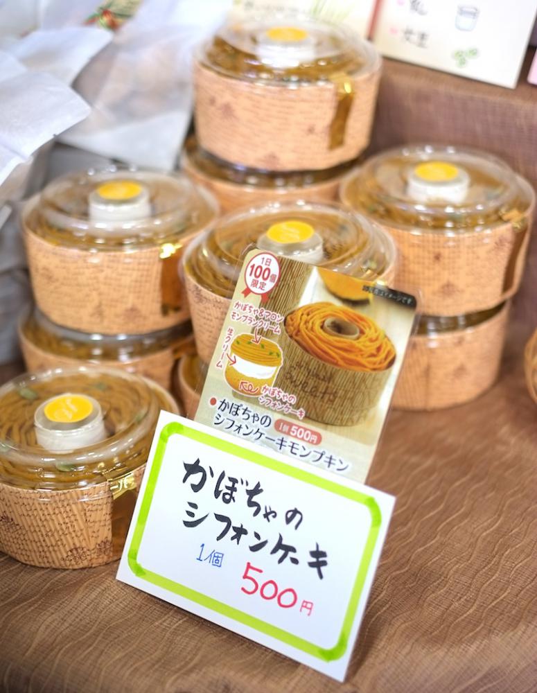 シフォンケーキの上に、かぼちゃと栗のモンブランクリームをたっぷりのせて仕上げました。