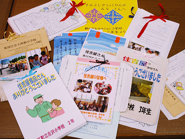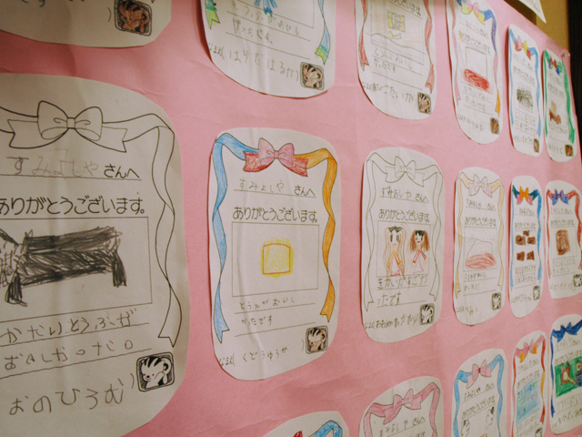 に工場見学に来てくれた皆さんのお礼のお便りを清流庵内に展示しております。