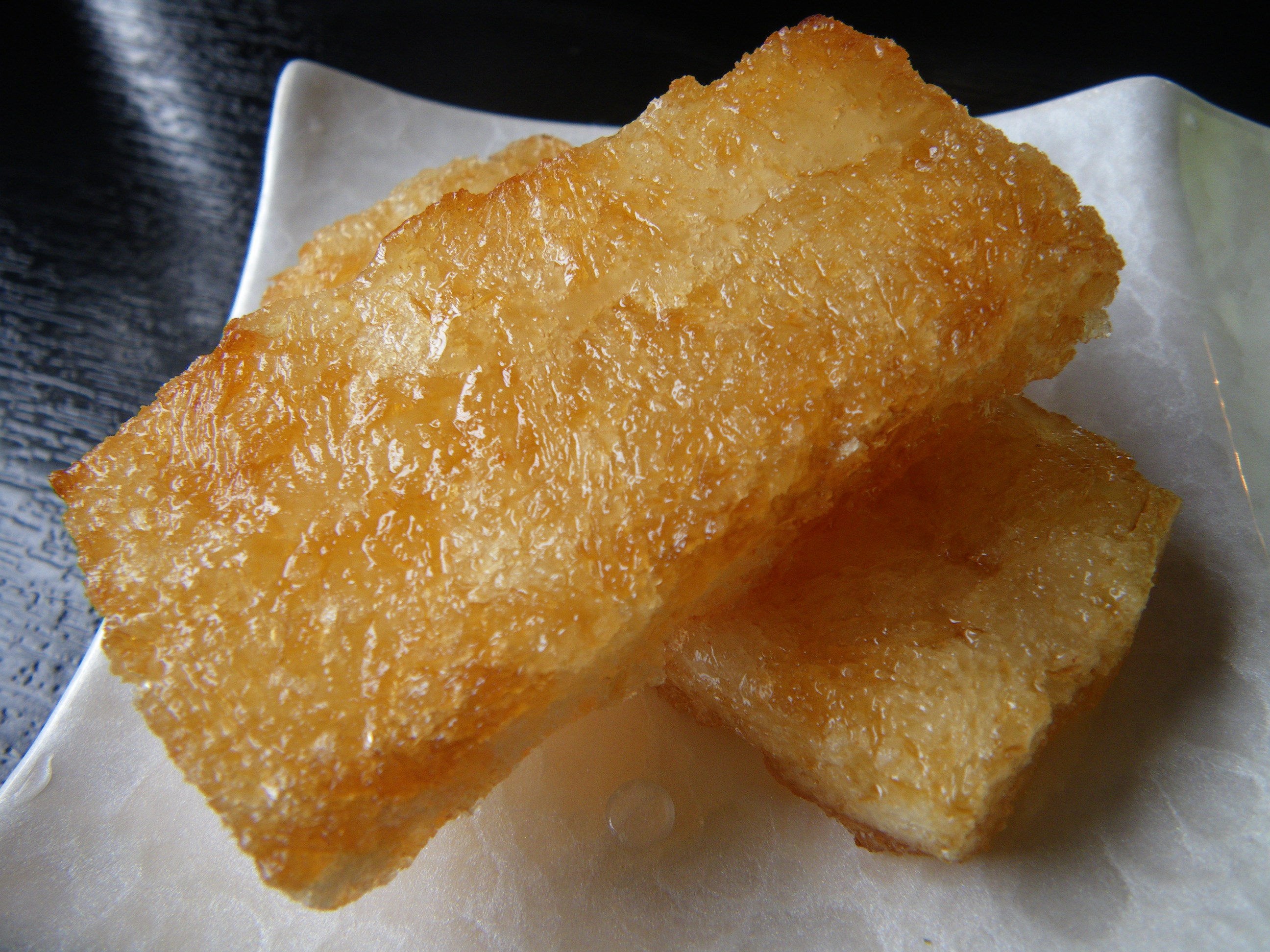 凍み餅を油で揚げて、お砂糖と醤油をまぶした郷土の味です。